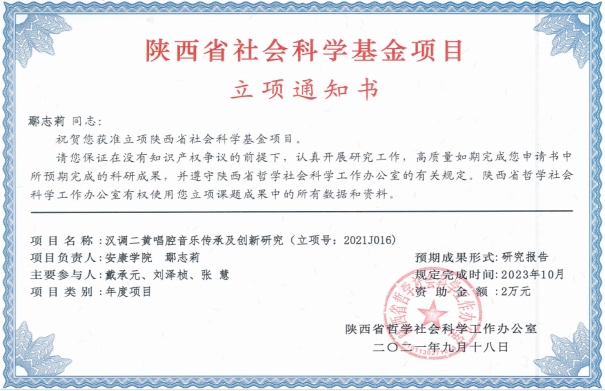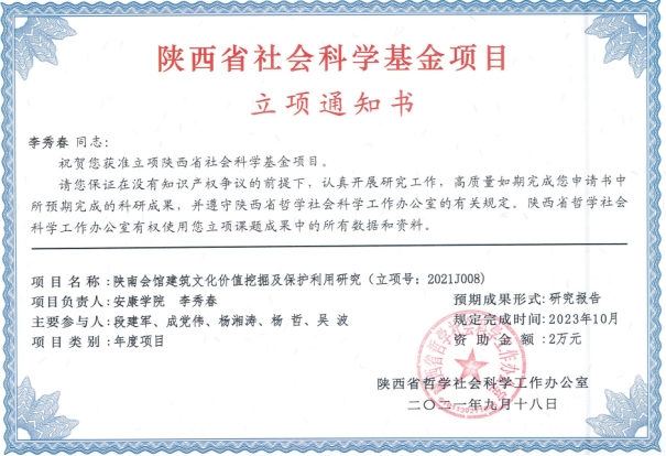 近日,陕西省哲学社会科学工作办公室公布了2021年度陕西省社科基金年度项目立项结果,今年会官网青年教师鄢志莉、李秀春申报的项目获批立项。