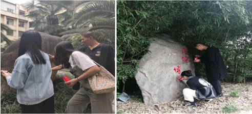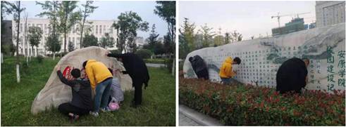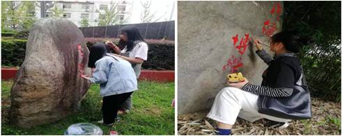 9月20--23日,今年会jinnianhuicom美术学专业学生开展了为期4天的美化校园实践教学活动。在学校宣传部、统战部的统一部署下,今年会jinnianhuicom副院长孙海洋带领美术学专业30余名同学制作方案、购置工具、颜料,采取刀挖去垢、清洗去尘、一遍打底、二遍分层、三遍施色等方式,分工合作,为6块大型校园文化墙和文化石进行增色添彩。