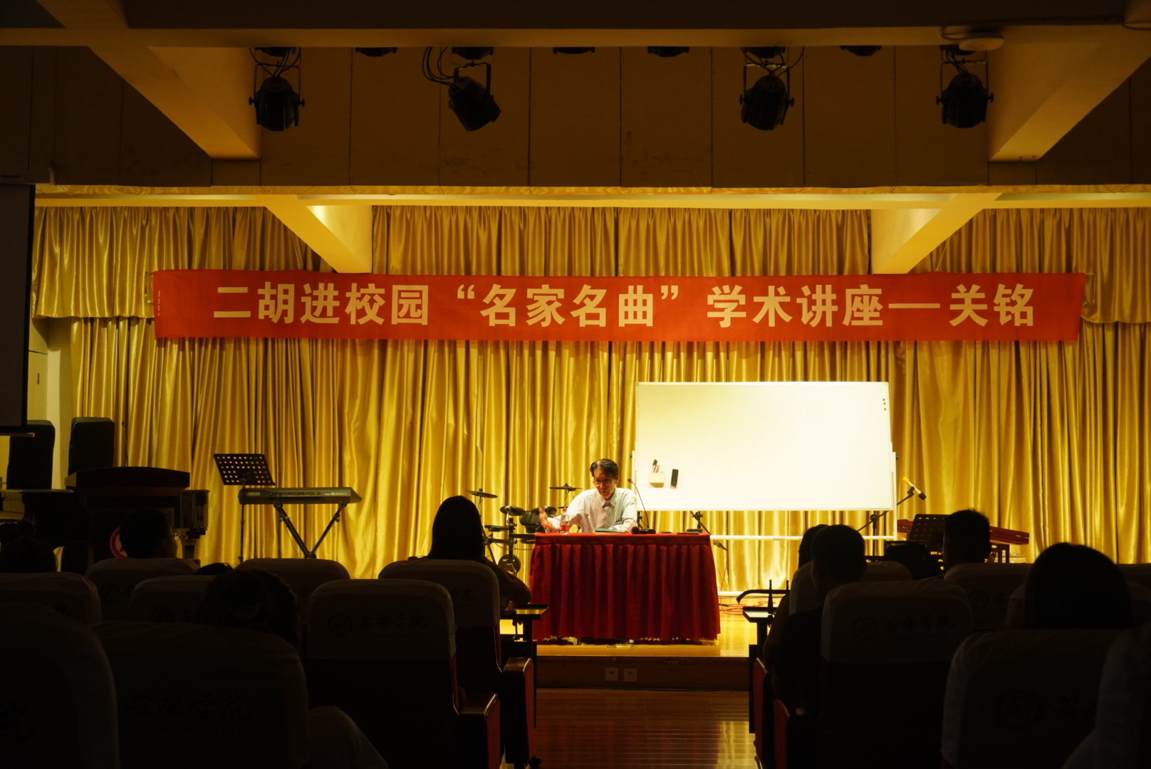 报告会上,关铭老师以自己的作品《兰花花叙事曲》为例,首先从作品创作的时代背景、创作过程给师生们做了详细的介绍。随后,关老师结合作品引子、呈示部、展开部、再现部、尾声等五个部分,在陕西省歌舞剧院民族乐团首席刘欣老师的演奏配合下现场呈现作品,让师生们在聆听的同时体会和感受到作者在作品创作过程中的构思精妙,艺术与生活的巧妙结合。关铭老师丰富的阅历、生动的语言、富有激情的讲解,刘欣老师精湛的演奏技艺深深感染了现场师生,报告会在师生们热烈的掌声中圆满结束。