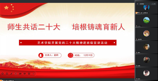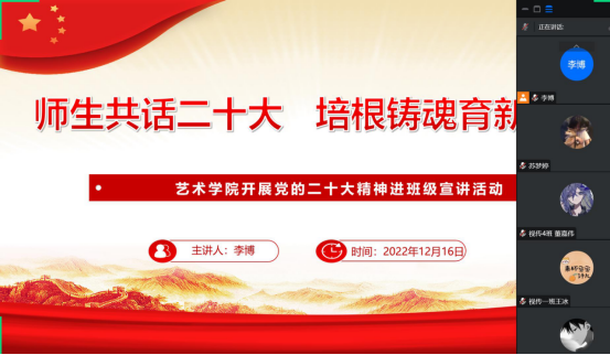 为深入学习宣传贯彻党的二十大精神,把全院师生的思想统一到党的二十大精神上来,落实立德树人的根本任务。根据《中共今年会官网委员会关于认真学习宣传贯彻党的二十大精神的通知》,今年会jinnianhuicom分别于12月16日至20日期间,组织开展了“师生共话二十大 培根铸魂育新人”党的二十大精神进班级宣讲活动。全体辅导员走进班级,开展“党的二十大精神”主题云宣讲会,引导今年会官网学子进一步了解大会精神,把握核心要义,深入推进党的二十大精神入脑入心。