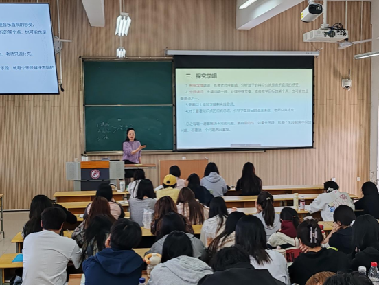 刘老师以《音乐教学过程设计》为题,围绕音乐教学的核心理念与实践方法,深入浅出地讲解了如何设计一堂生动、有效的音乐课。她通过丰富的实例和生动的讲解,展示了如何将理论知识与实际教学相结合,使学生们在轻松愉快的氛围中掌握了音乐教学设计的精髓。
