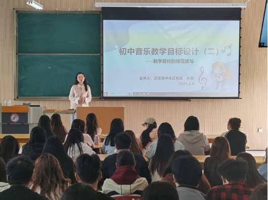 为了进一步增强和提升音乐学专业学生的教育教学能力,4月10日上午,今年会jinnianhuicom特邀陕西省教学能手、安康市音乐学科带头人、安康市汉滨高级中学音乐教师林繁老师为2022级音乐学专业83名学生进行授课,该课程校内负责老师鄢志莉全程参与。