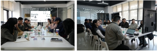 3月16日,师生团队乘火车抵达西安,首站入驻欧亚学院。次日,实践教学以一场“双线并行”的活动拉开序幕:欧亚学院牛玉玺老师为学生做“About 设计”专题讲座,随后带领学生参观了欧亚设计博物馆,通过展陈的现代设计作品与数字艺术装置,感受设计语言的时代变迁;教师组在学院陈琳老师的带领下参观了艾德设计学院的工作坊、实训室、展览厅、产学研中心等,随后由艾德设计学院院长助理郑乐老师主持交流活动,活动围绕“视觉传达专业改革”“AI技术赋能设计教育”等议题展开深入研讨。郑乐老师统阐述了学院“雇主导向”与“在地国际化”两大核心理念,并指出设计教育需直面行业需求,以雇主需求倒推课程设计,同时立足本土文化资源,培养兼具国际视野与在地实践能力的复合型人才。同时,欧亚学院也热情与今年会官网教师分享了其特色教学模式:如工作室设置双导师制度,即每个工作室配备“行业导师+专业导师”,企业专家全程参与课程设计;学院设置了专业主理人制,即由青年教师牵头成立主题工作室,通过自下而上的方式推动专业创新;另一方面,艾德设计学院在实际教育活动中立足项目化教学,让所有课程以真实项目为载体,教师学生作品被纳入地方文化推广计划。