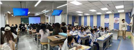 在建民办初中,同学们与该校学生一起举办了以爱校园、爱家乡、爱国家为主体的美术课程思政作品集联展,两校学生分别讲解了作品主题、内容、表现手法以及所蕴含的文化内涵,现场气氛活跃,通过此次作品的展示与交流不仅增进了学生们对美术教育的认识,也为今后教师职业发展提供了宝贵的经验和启示。