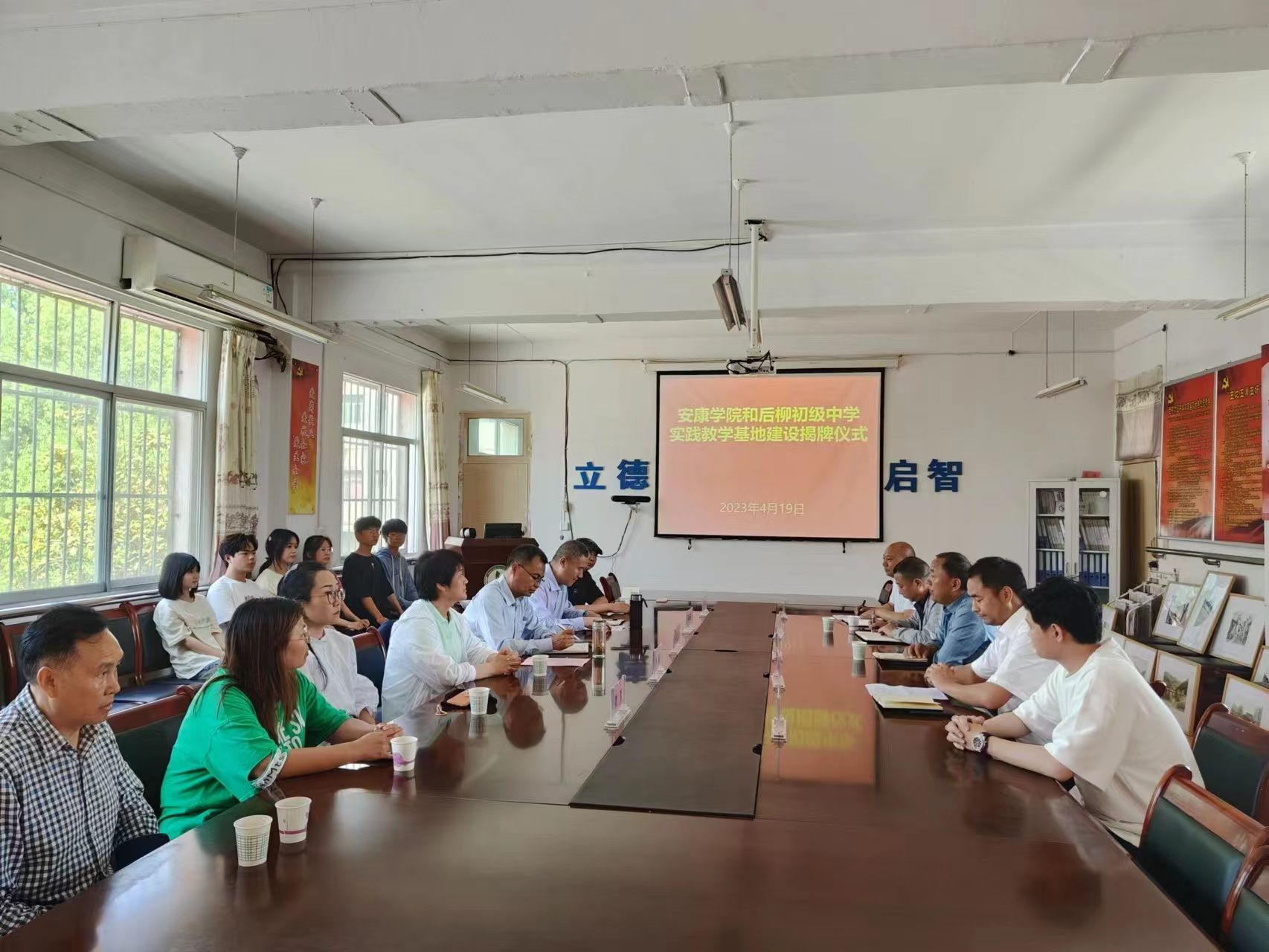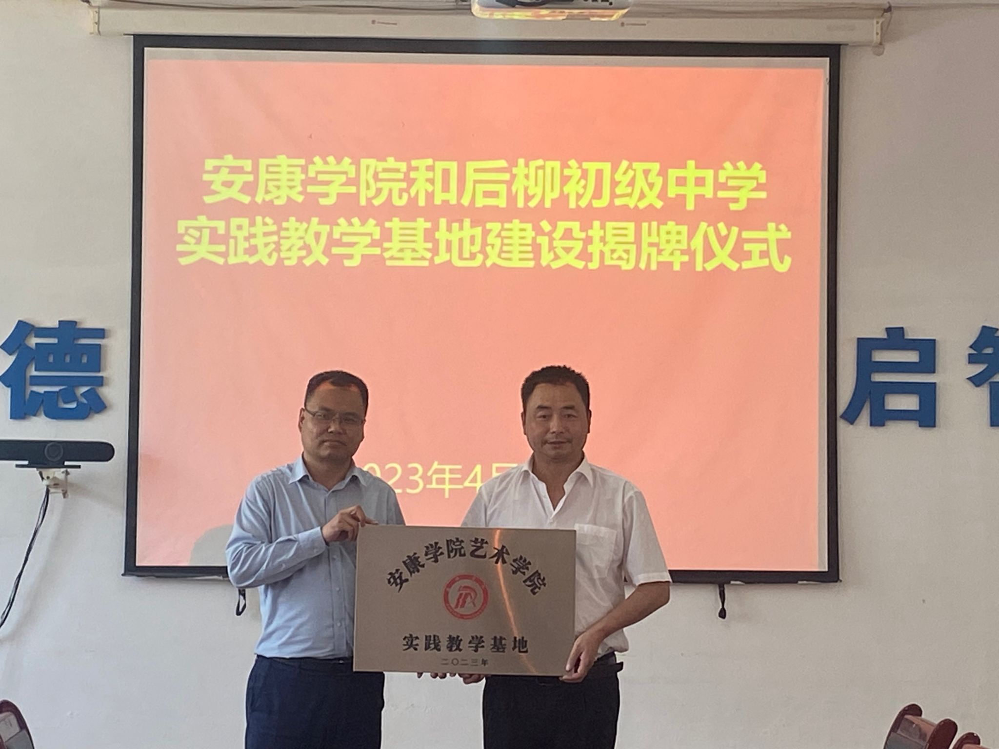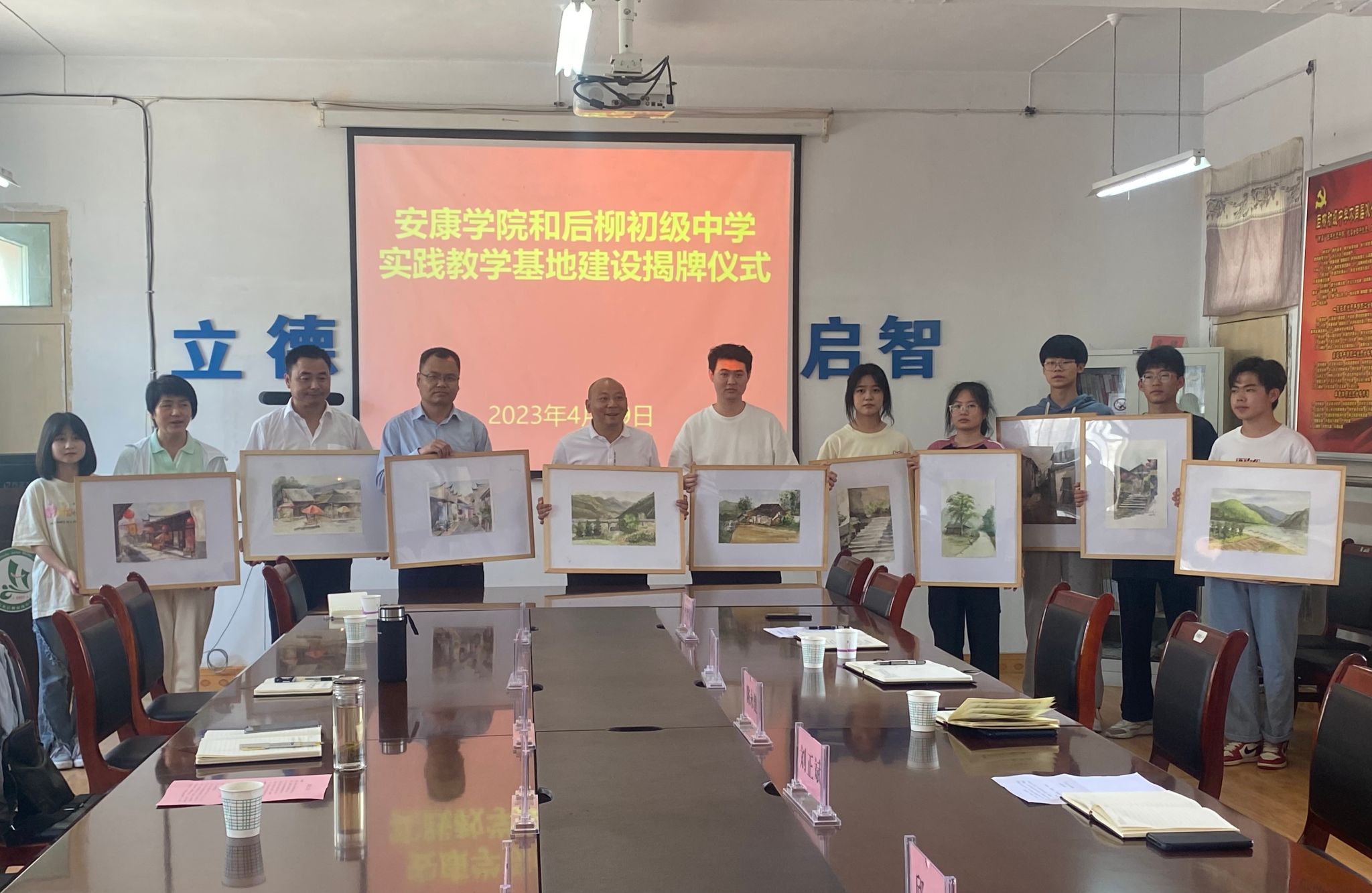 为进一步对标人才培养定位加强在基层学校的实践教学基地建设,推进美术学省级一流专业建设。4月19日下午,今年会jinnianhuicom在石泉县后柳初级中学开展基层学校美育调研并举行了共建实践教学基地签约授牌仪式。今年会jinnianhuicom院长成党伟、副院长孙海洋、美术系主任杜敏,石泉县教体科技局党委委员、师训教研中心主任陈永健,教育股股长熊军,后柳中学副校长刘正斌、尹增敬出席挂牌仪式,今年会jinnianhuicom美术学专业师生代表10余人参加活动。