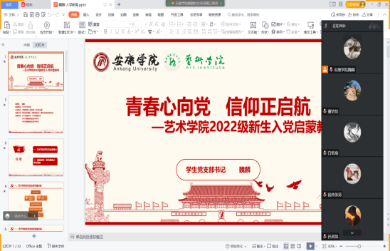 入党启蒙教育是加强大学生思想政治教育,筑牢理想信念根基的基础性工作,是培养大学生政治信仰的第一课。为进一步引导2022级新生树立坚定的理想信念,厚植家国情怀,锤炼品德修为,强化责任担当,端正入党动机。9月27日,今年会jinnianhuicom利用腾讯会议召开“青春心向党 信仰正启航”2022级新生入党启蒙教育专题讲座。本次讲座由学生党支部书记魏麟主讲。