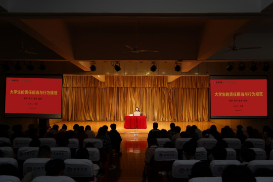在讲座上,鲁澧向新生们强调了大学生的责任和行为规范的重要性。她指出,大学生作为社会的一员,应该承担起积极的责任,为社会的发展贡献自己的力量。首先,大学生要有学习责任。要履约践诺,知行统一,珍惜大学时光,努力学习,应树立明确的目标。只有通过不断的学习和进步,才能为社会带来更多的智慧和创新。其次,大学生要有社会责任意识。她强调了大学生对自我、家庭、集体和国家的责任担当,鼓励学生们认识责任,并在日常学习和生活中履行责任。同时,大学生应该保持文明礼仪。应该尊重他人,保持良好的礼貌和行为举止。应该遵守校园规定,保持校园环境的整洁和安全。通过文明礼仪的表现,可以树立大学生良好的形象,为校园营造和谐的氛围。最后,鲁澧强调了大学生的学习态度和行为规范问题。她表示,大学生应当认真学习,不断提升自身知识水平和能力素质。此外,在日常生活中,也要注重文明行为的养成,积极参加校园文化活动,提高自己的综合素质。