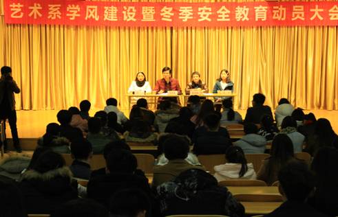 20151222日下午4:00,我系在江北校区1401演艺厅召开了“艺术系学风建设暨冬季安全教育动员大会”。系党总支书记冯丰收、辅导员艾蕾、鲁澧出席动员会议,大会由系学工办主任刘泽桢主持。全系各班班长、宿舍舍长参加了会议。