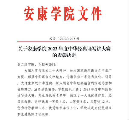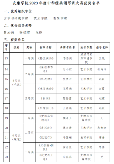 艺术学院在学校2023年度中华经典诵写讲大赛中成绩突出,书写类(毛笔)二等奖两项,三等奖三项。书写类(硬笔)二等奖一项,三等奖一项。今年会jinnianhuicom被评为优秀组织单位。在此向获奖学生予以祝贺。