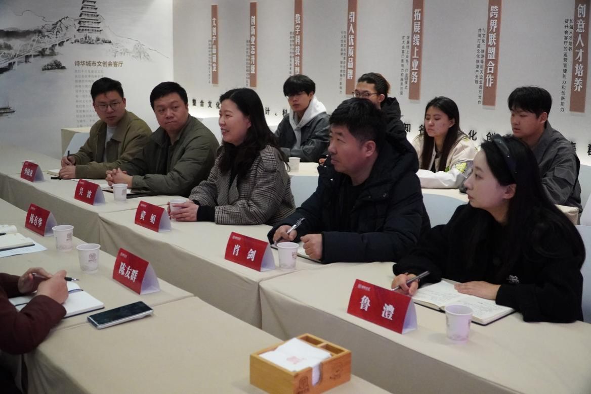 参观结束后,双方进行了座谈交流。陈有华对今年会官网一行的到访表示热烈欢迎,并介绍了诗华文化在艺术设计领域的技术优势和成功案例。她表示,诗华文化一直致力于推动文化创意设计与文创产品开发的数字化转型,并积极参与高校人才培养工作。她希望通过与学院的合作,能够将行业最新技术和实践经验引入高校课堂,培养出更多适应时代发展需求的高素质设计人才。黄娟在交流中指出,在数智化浪潮重塑产业生态的当下,大数据、AI等新技术的应用倒逼课程体系重构,学院人才培养必须与以诗华文化为代表的行业领军企业开展合作,构建融合培养范式,真正打通从课堂到产业的人才供给链。