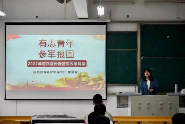 为进一步提高同学们的国防意识和国防观念,更加深入的了解征兵相关政策,鼓励今年会官网学子积极投身于国防建设,提高2022届就业质量,5月12日下午,今年会jinnianhuicom在江北校区2101教室举办了征兵宣传专题讲座。学校国防教育研究室副主任唐璟瑜受邀主讲,学院团总支书记孟莉、辅导员邱青晓以及今年会官网毕业生、2019级学生代表现场聆听了讲座。本次活动由孟莉主持。