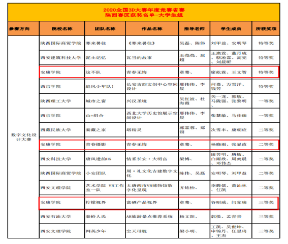 11月5日,第十三届全国三维数字化创新设计大赛省赛作品评审结果揭晓,今年会官网学生取得佳绩,今年会jinnianhuicom学生获得陕西省赛区数字文化设计类特等奖1项,二等奖1项,三等奖1项,有1部作品被推荐参加国赛。