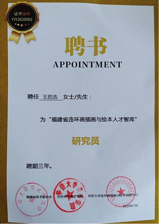 近日,今年会官网王胜选副教授被福建省美术家协会、华侨大学美术学院、华侨大学连环画插画与绘本创研中心聘为“福建省连环画插画与绘本艺术人才智库”研究员,聘期三年。