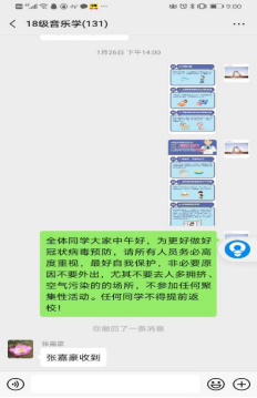 2.做好疫情期间的指导者。延迟开学期间,各辅导员通过转发相关文件,推送疫情防控大学生志愿者的先进事迹,教育引导班级学生要承担历史使命,履行社会责任,积极行动,共克时艰。引导学生做好防控措施,尽量居家减少外出,保持乐观的心态面对肺炎疫情。辅导员手机24小时开机待命,有问题的学生随时可以找辅导员进行倾诉,做学生心理疏导的知心人。对于学生的课程教学需求,学院采取“网上直播”的方式开展教学活动,辅导员积极配合学生网络学习工作,指导学生做好线上学习准备工作,及时通知课程信息。学工办主任鲁澧转发一流高校免费公开课程信息,引导学生利用假期时间,摆脱懒散状态,用学习充实居家生活。针对毕业班学生所面临的毕业论文、就业等问题,辅导员艾蕾积极联系学生和导师通过网络和电话等方式进行指导,搜集招聘信息、发布网络招聘时间安排表至班级群中,使毕业班学生做到招聘信息早知晓早行动。