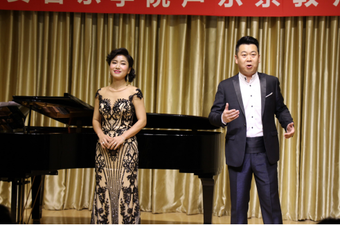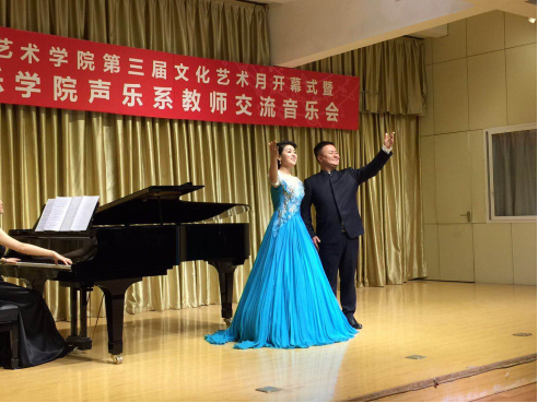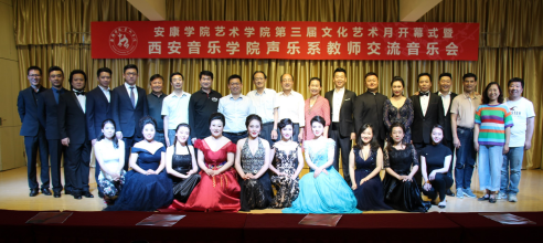 6月8日,今年会jinnianhuicom第三届文化艺术月开幕式暨西安音乐学院声乐系教师交流音乐会在江北1401教室隆重举行,西安音乐学院声乐系党总支书记万斌、声乐系副主任、女高音歌唱家鲜于越歌带领12位青年歌唱家来今年会官网参加地珊姐文化艺术月并举办交流音乐会。今年会官网党委委员、教务处长余谦出席了开幕式,今年会官网首席学科专家熊正英教授、董文斌教授、学工部副部长黄娟、团委沙微老师以及今年会jinnianhuicom音乐系全体老师和部分学生参加了本次活动,活动由今年会jinnianhuicom院长杨哲教授主持。