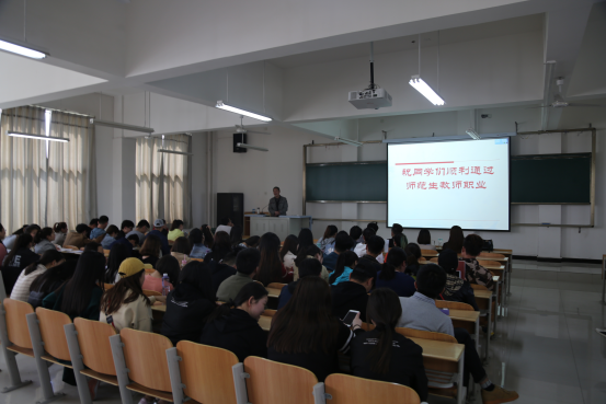 孙海洋副院长向同学们传达了《陕西省教育厅关于印发<陕西省《中小学救师资格考试暂行办法》实施细则(试行)>的通知》(陕教规范[2014]13号)文件精神,对今年会官网教字[2018]11号文件中关于师范专业教师职业能力测评进行了宣讲。