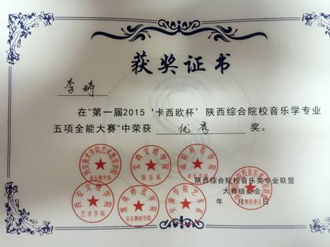 本次比赛项目分为:钢琴演奏、歌唱与钢琴伴奏、自弹自唱、综合音乐知识及自选项目,分别设五项全能奖和各比赛单项奖。经过激烈角逐,我系2012级学生蒋亮亮获得“歌唱与伴奏”单项奖、 2013级学生尚玥、2014级学生李婷获得“优秀奖”。