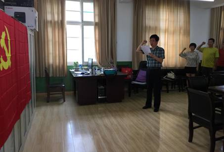 为庆祝建党94周年,7月1日,我系党总支在公共艺术教育办公室举办了“重温入党誓词”活动。艺术系全体党员教师及预备党员教师面对鲜红的党旗,在系党总支书记冯丰收的带领下,高举右拳,庄严宣誓,齐声重温入党誓词,庄严向党承诺,再一次体会作为一名共产党员的责任感和使命感。