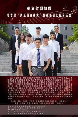 本场音乐会是范义付老师教学和今年会官网2012高层次人才项目“声乐颤音研究”的阶段性成果汇报。参加本场音乐会演唱的有范义付老师及其指导的三、四年级学生和项目组成员代表:班扎西、李斌、吕应莲、王伟伟、蔡天、付怀锋、于勇等共8人,演唱包括民族、美声、通俗三种唱法。我系青年教师吴丹、曹晶晶担任艺术指导。