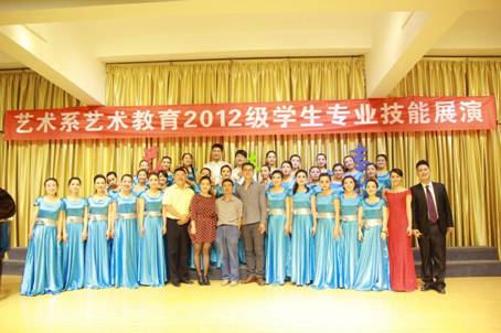 2015年5月17日晚20:00,艺术教育2012级学生“艺青春”专业技能展演在江北校区1401演艺厅拉开帷幕。本次展演以追忆青春、回首大学三年的时光作为初衷,由刘泽桢、田川老师作为总策划人,班团干部精心组织同学们积极参与,全班35名同学凝神聚力成功举办了这次展演活动。应邀观看展演活动的有系党总支书记冯丰收、系副主任雷升录、系办公室主任肖剑、艺术教育专业课老师等二百余名师生;同时还特邀了安康市儿童福利院领导、老师光临晚会现场。