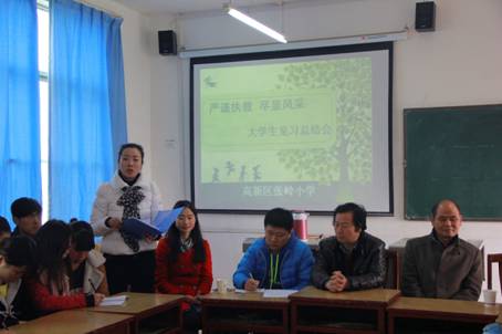 张岭小学校长张玉顺、我系教学主任雷升录老师、学工办主任刘泽桢老师、教研室代主任田川老师分别讲话、总结这次见习活动的感受并向所有见习大学生提出要求,寄予希望!