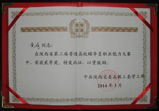 4月9日,陕西省第二届高校辅导员职业能力大赛决赛在陕西师范大学举行。来自全省19所高校的24名辅导员同台竞技,我系辅导员黄娟获得决赛二等奖。