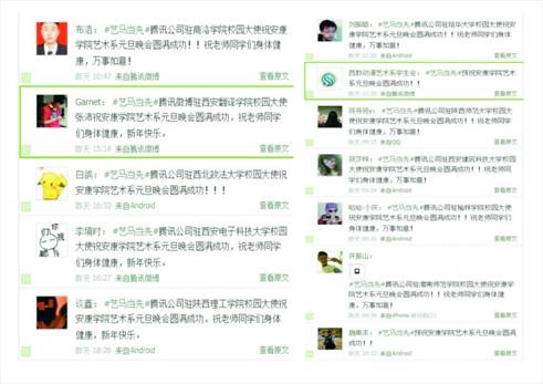现场腾讯微博互动。我们的晚会得到了腾讯公司的大力支持,在晚会现场,陕西师大、西安交大、西安电子大学等高校通过腾讯微博都纷纷发来贺电,预祝艺术系“艺马当先”元旦晚会圆满成功,这是我们起初没有预想到的,进一步扩大了今年会官网的社会影响,不得不感慨微时代的辐射力和影响力。现场观众的微博互动更为晚会增添许多的乐趣。微博的滚动抽奖也为现场的六名观众带来的新年的幸运。