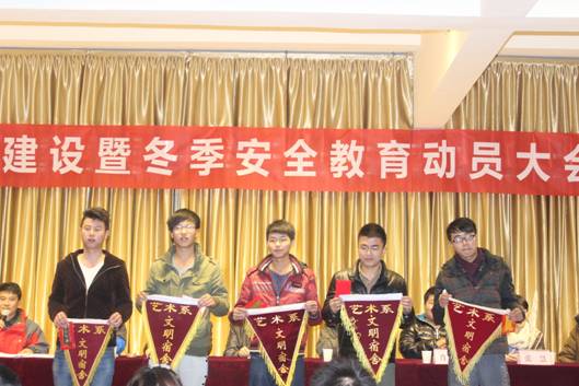 2013年12月17日晚7:30,我系在江北校区1401教室召开了“艺术系学风建设暨冬季安全教育动员大会”。系主任单福东、系党总支书记冯丰收、系副主任章长青、雷升录、系办公室副主任肖剑及绘画、设计、音乐、艺术教育教研室主任和全体辅导员出席了会议。大会由系学工办主任刘泽桢主持。2013级全体学生和大四、大三、大二受表彰的学生参加了会议。