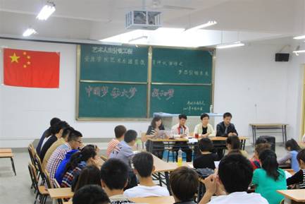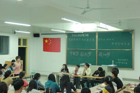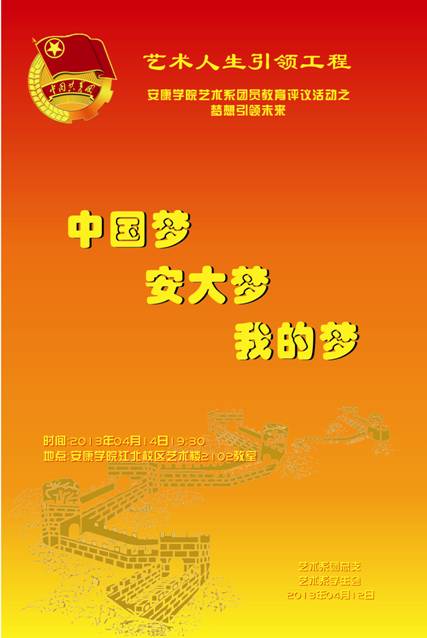 2013年4月14日晚7:30分,艺术系团员教育评议系列活动之“中国梦·安大梦·我的梦”座谈会在江北校区2102教室隆重召开。艺术系党总支书记冯丰收、学工办主任刘泽桢、学生党支部书记王毅、团总支书记黄娟以及各班团支部成员、班长约一百余人参加了座谈会。会议由黄娟老师主持。