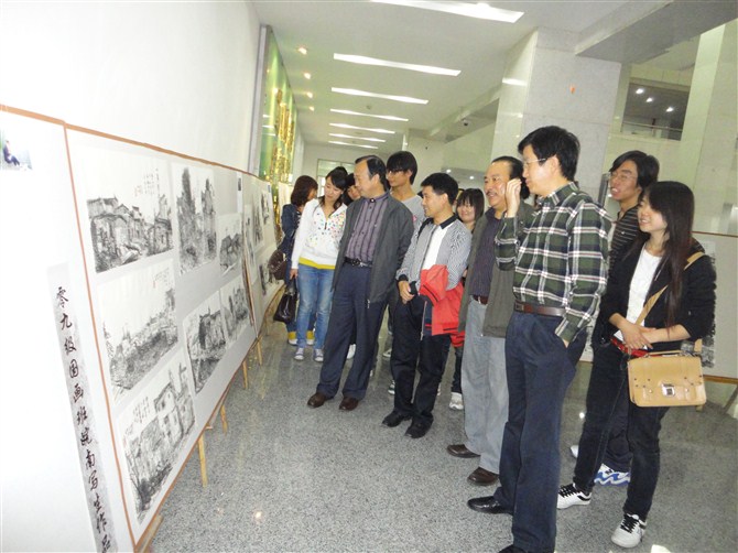 2011年10月18日到10月24日,艺术系09级美术学国画班举办的“皖南之行写生汇报展”在图书馆举行,我系主要负责人亲临现场,对每位同学的画提出好的建议和指导。