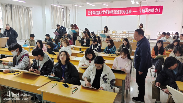 在讲座中,何涛老师以实践教学经验为脉络,分别对中学美术课以何种形式来上?都包含哪些课程内容?速写的重要性、速写发展简史以及常用表现形式等知识点进行了讲解,并现场进行速写实践绘画示范教学,对学生进行速写绘画指导。历时110分钟的讲座在同学们热烈诚挚的掌声中结束,同学们收获颇多,受益匪浅。副院长孙海洋在总结中强调:此次活动是本学期的第一次活动,今年会jinnianhuicom将以卓越师资班系列活动,不断强化美术学专业内涵建设,促进专业建设再上新台阶。