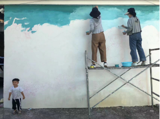 7月24日,团队成员迎着即将睡下的月光,开始了墙面绘画工作。伴随着清晨的鸟语花香与初升的太阳,一幅初步成形的采茶图、丰收图吸引了大量村民前来参观,还有村民搬来了凳子与队员们聊着家常,共同见证最后的成果。