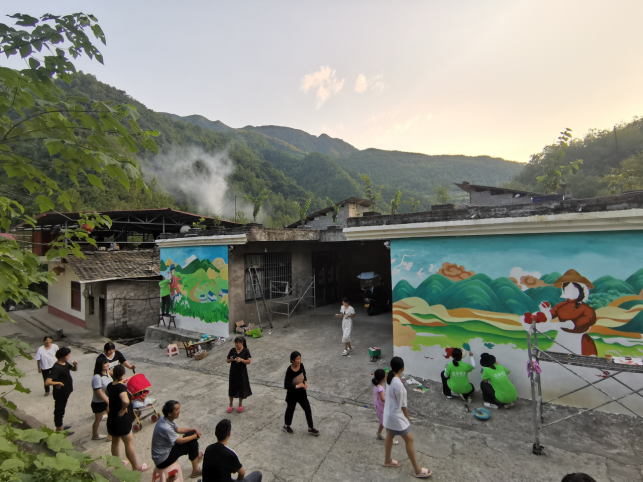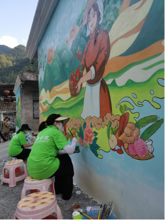 7月25—26日,院领导成党伟院长亲临现场指导,看到干劲十足的队员们,主动要求承担保障工作、接送队员、上色勾线。通过队员们的起早贪黑、顶着烈日的不懈努力,采茶图、丰收图和乡村振兴图终于大功告成,精美的画面、绚烂的色彩成为了村庄一道美丽的风景线,营造了文化氛围、提升了村庄风貌、激发了乡村活力,受到镇村领导和村民们的一致好评。