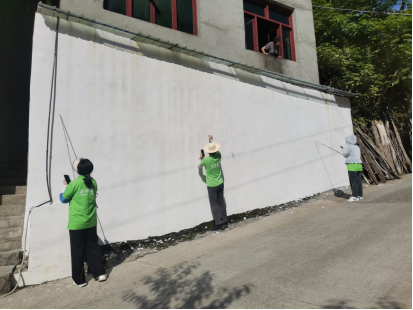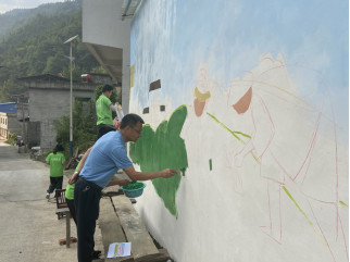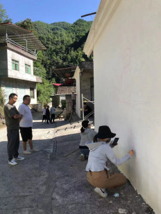 7月23日下午,团队一行在村委会进行交流。驻村队员来昌浩介绍了村庄的基本情况及村庄环境美化的诉求与目的,第一书记王玉山就如何开展主题墙绘美化乡村、大力宣传乡村振兴战略进行了交流。随后,团队根据前期商讨的方案计划及现场交流的要求,来到实践地点进行描底、勾线、调色、开始墙画绘制。