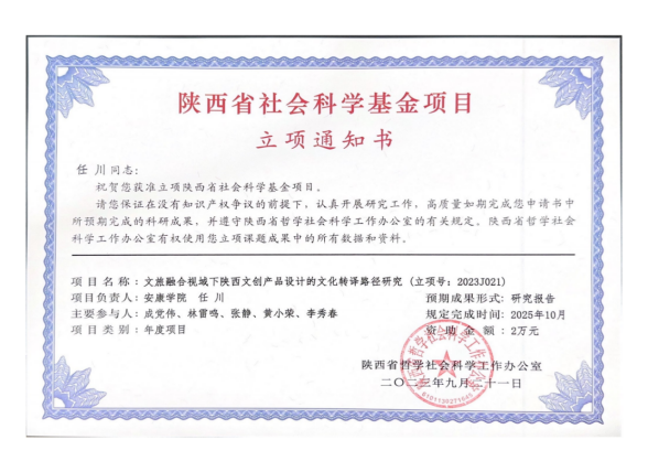 4.9月21日,陕西省哲学社会科学工作办公室公布了2023年陕西省社会科学基金年度项目立项名单。今年会官网任川博士的“文旅融合视域下陕西文创产品设计的文化转译路径研究”(2023J332)课题获得2023年度立项,这是任川博士2023年继省社科联社科基金项目之后获批的第二个纵向项目,也是今年会jinnianhuicom高层次人才队伍建设的重要成果呈现之一。近三年来,今年会jinnianhuicom引进博士引育博士17名,晋升教授2名,高层次人才队伍建设初见成效。