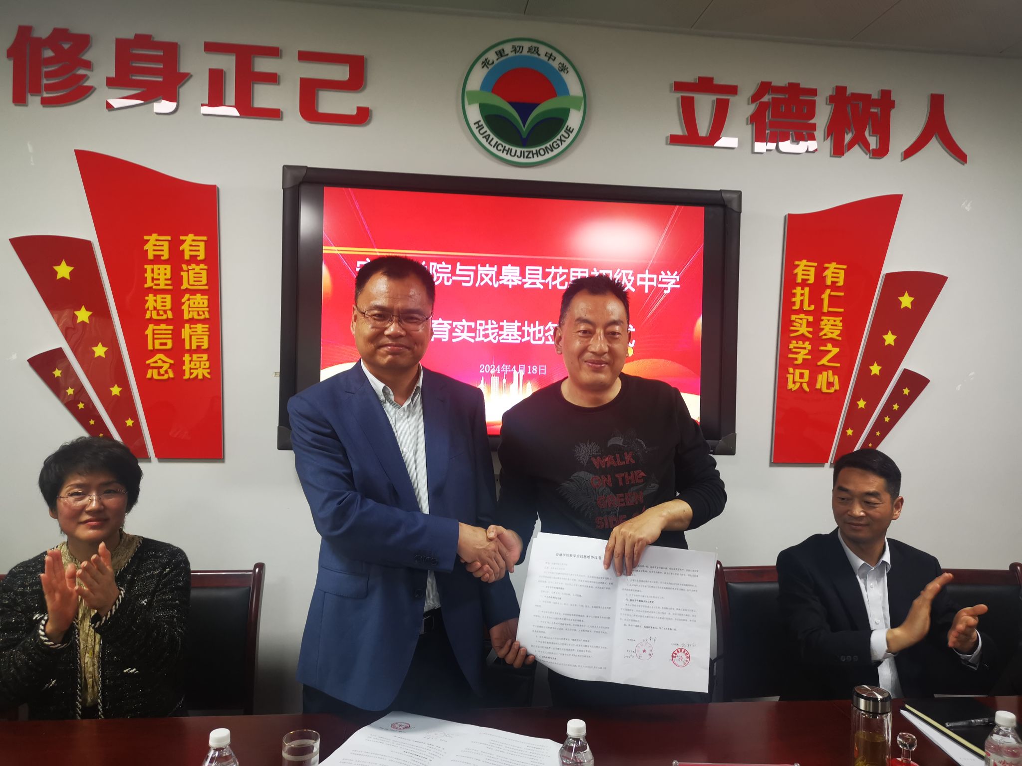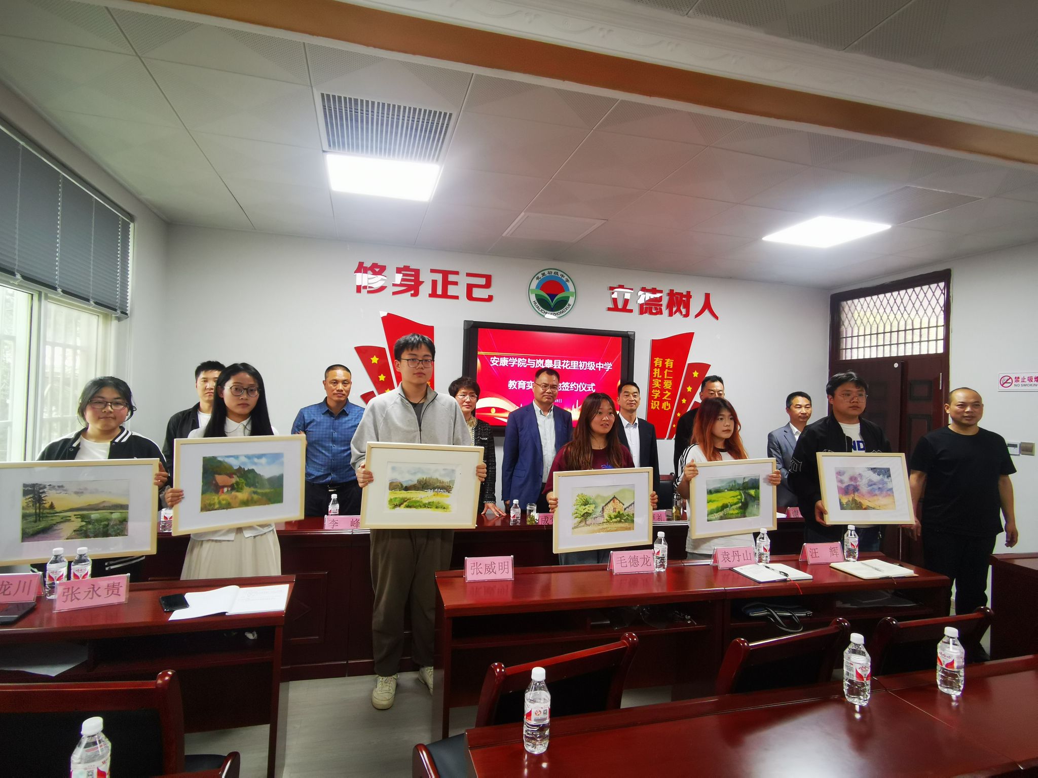 随后,今年会jinnianhuicom与岚皋县花里初级中学举行了美育实践基地签约仪式,今年会jinnianhuicom院长成党伟和岚皋县花里初级中学校长狄邦银代表双方签约,岚皋县教育体育科技局教育衔接办主任丁更礼见证签约,活动由花里中学政教主任谢战主持。双方就共同促进美育工作签订了美育实践基地共建协议。活动中,今年会jinnianhuicom12位同学把第一批12幅美术写生作品捐赠给花里初级中学作为美育教学资源。