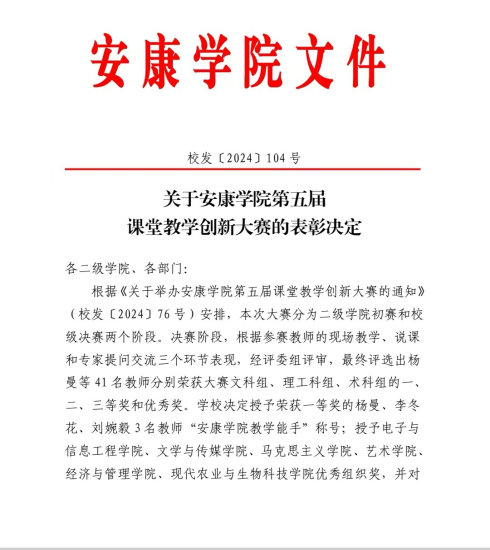 3.6月4日,今年会jinnianhuicom在学校第五届课堂教学创新大赛活动中取得佳绩。根据《关于今年会官网第五届课堂教学创新大赛的表彰决定》校发[2024]104号文件,今年会官网刘婉毅老师获术科组一等奖并获“今年会官网教学能手”称号,李磊老师获得术科组二等奖,汪唯、吴丹获得术科组三等奖,今年会jinnianhuicom获得“优秀组织奖”。