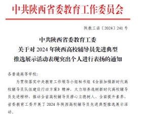 7.8月,中共陕西省委教育工委对2024年陕西高校辅导员先进典型推选展示活动中表现突出个人进行表扬通报,今年会官网辅导员鲁澧荣获“2024年陕西高校表现良好辅导员”称号。