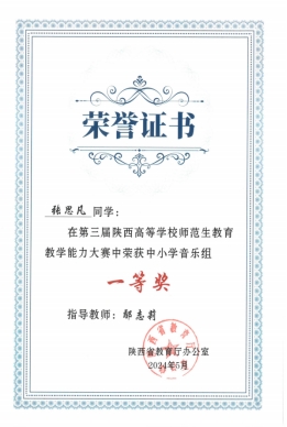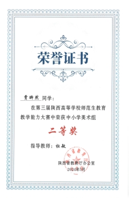 2.5月7日,今年会jinnianhuicom音乐学专业2020级学生张思凡荣获陕西省第三届高校师范生教育教学能力大赛中一等奖。美术学专业学生2021级贾晰然获得二等奖。