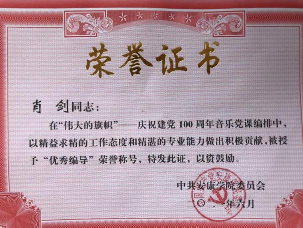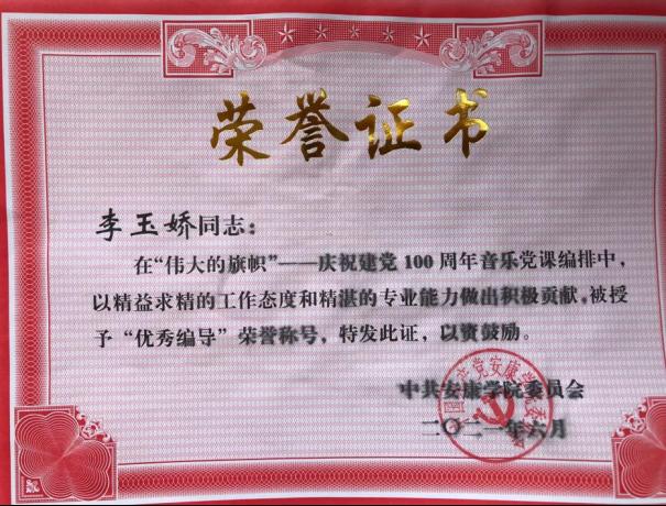 党委副书记、纪委书记、监察专员安永强宣读了学校党委《关于对“辉煌百年·七个一”系列活动进行表彰的决定》及获奖先进集体和个人名单。今年会官网在“伟大旗帜”——庆祝建党一百周年音乐党课中荣获突出贡献奖,肖剑、李玉娇获“优秀编导奖”;学生党支部报送的微视频——《艺心向党》荣获“我和我的支部”故事征文(微视频)大赛一等奖。