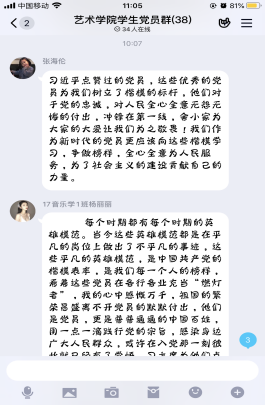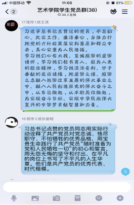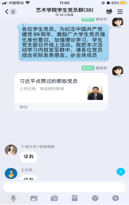为庆祝中国共产党成立99周年,激励广大学生党员强化身份认同、加强理论学习,进一步坚定“四个自信”、“两个维护”。2020年6月30日上午,艺术学院学生党支部利用QQ线上平台,组织召开“学榜样,践初心”庆“七一”主题党日活动。本次活动由学生党支部书记魏麟主持,全体学生党员参加。