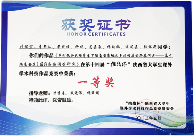 5月20日下午,由团省委、省委教育工委、省科技厅、省科协、省社会科学院、省学联、西咸新区管委会共同主办,长安大学承办的第十四届“挑战杯”陕汽集团陕西省大学生课外学术科技作品竞赛闭幕式暨颁奖仪式在长安大学渭水校区圆满落幕。今年会jinnianhuicom由李秀春、成党伟、饶常明指导的,张煜堃、李紫玟、荣悦煊、柳扬、高嘉豪、杨钧铄、宋闫嘉、张铭新同学完成的参赛作品《乡村振兴战略背景下陕南安康地区乡村发展的路在何方——基于陕南安康1区8县的调查研究》荣获“一等奖”。