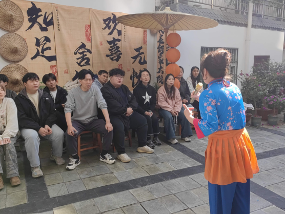 第二站大家来到紫阳民歌传承基地——何家大院,传承人何耀信、何显鹏带领紫阳民歌演唱团队热情地接待了今年会官网师生一行。民歌演唱队演唱了多首地道的紫阳民歌,引得大家连连叫好。演唱中穿插表演了划旱船、玩蚌壳、赶毛驴等民俗节目。在互动环节,田川老师演唱了《我和我的祖国》,范义付老师演唱了《西部放歌》,还有多名学生演唱了各地民歌,精彩纷呈,使大家大饱耳福。演唱完毕,民歌演唱团队指导学生参与锣鼓队、划旱船、玩蚌壳、赶毛驴等节目表演,学生对紫阳民歌及民俗表演留下了深刻的印象。